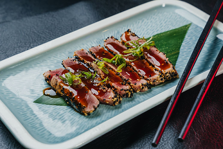 Tataki de atún shutoro en salsa teriyaki, cebollino y sésamo